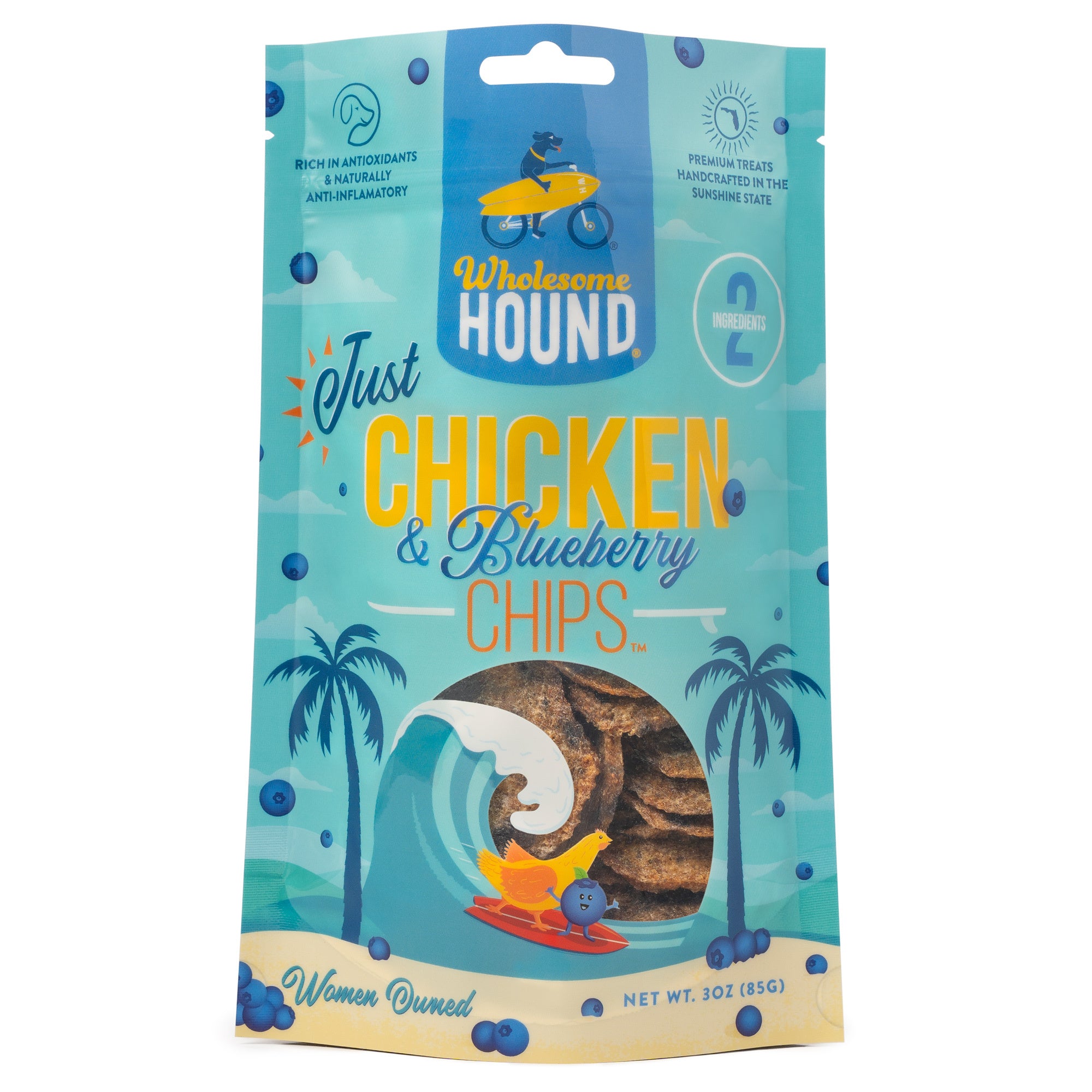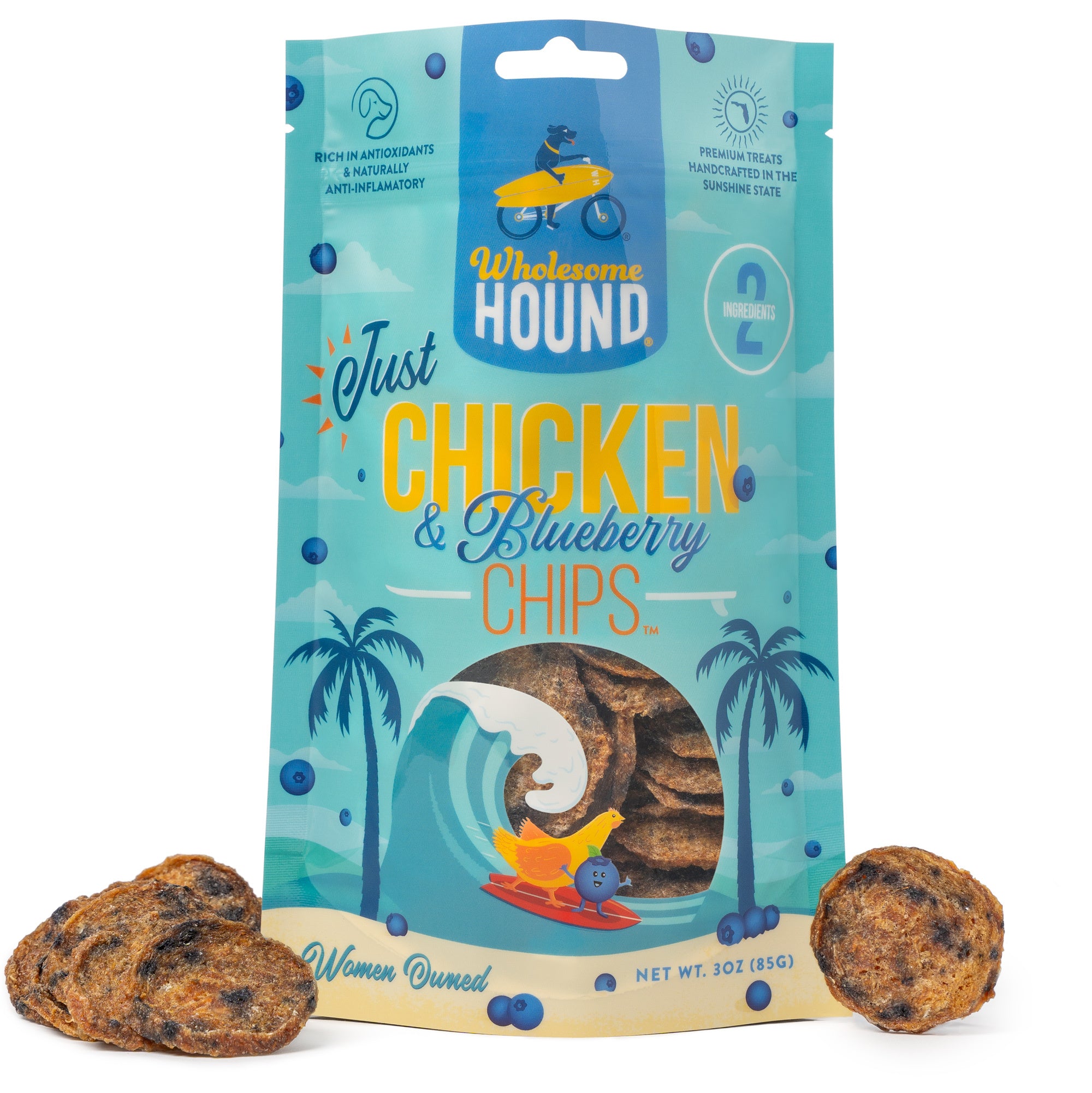 Just Chicken & Blueberry Chips are healthy, all-natural dog treats that start with our original single-ingredient recipe, then add fresh blueberries for a powerful antioxidant and anti-inflammatory boost. These are the best healthy treats for dogs of all sizes and ages, from puppy to senior, big to small, and picky eater to eats-anything.