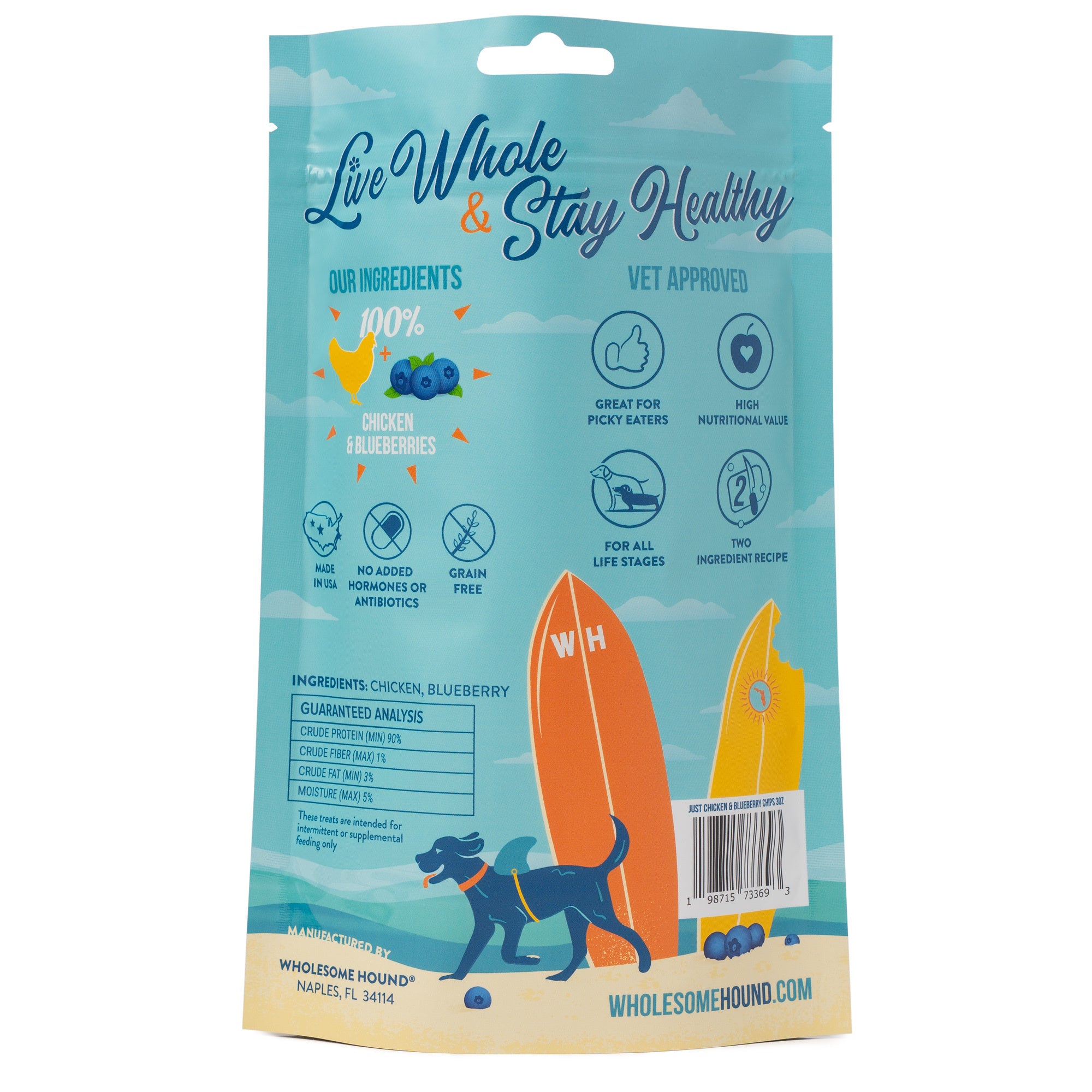 Each vet-approved chip is made with human-grade chicken tenderloin and blueberries, gently air dried to crispy, crunchy, dehydrated perfection. Our "high-value" chicken chips can be broken into smaller pieces for training, rewarding, or for smaller mouths. Every chip provides single-source protein and contains no fillers, preservatives, added ingredients, or flavors, just wholesome goodness!